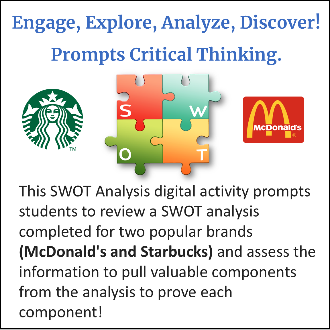 This engaging SWOT Analysis Digital Activity teaches students how to analyze real businesses using the SWOT framework (Strengths, Weaknesses, Opportunities, Threats) while building meaningful marketing and entrepreneurial thinking skills.