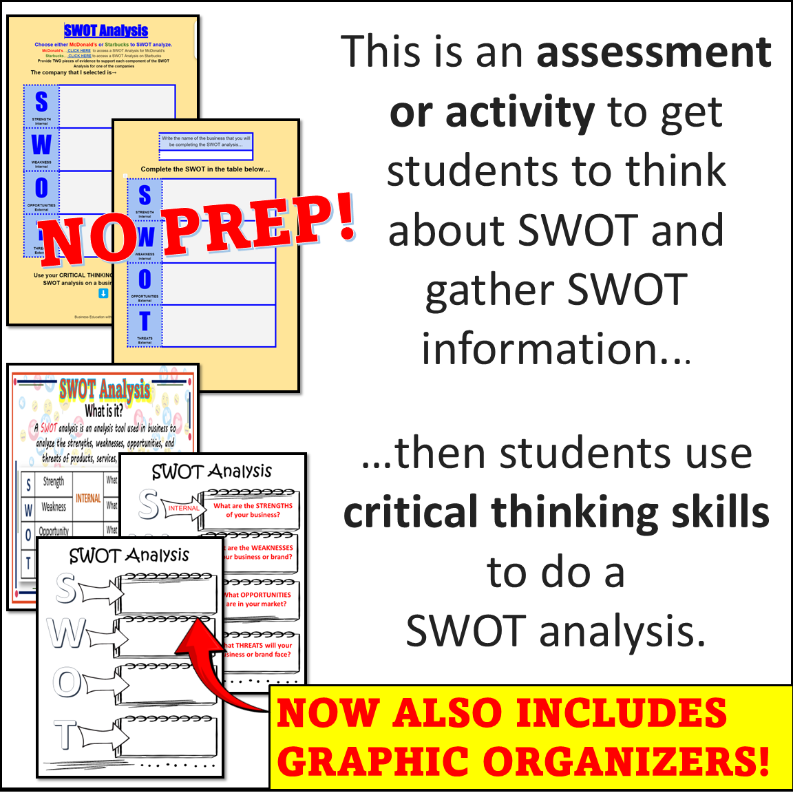 ✔️ Students use the organizer to record strengths, weaknesses, opportunities, and threats of a business, product, or service of their choice